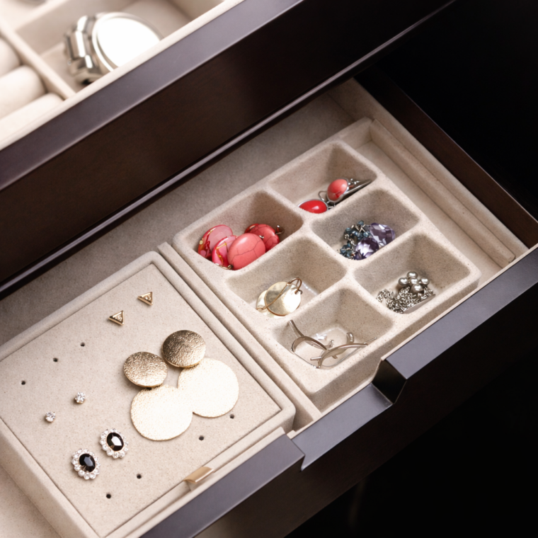 Upgrade and customize your jewelry armoire with this set of four interchangeable drawer inserts. Designed with three compartment styles — including ring rolls, stud panels, and divided storage sections — these trays help keep earrings, rings, and small accessories neatly organized and easy to access.