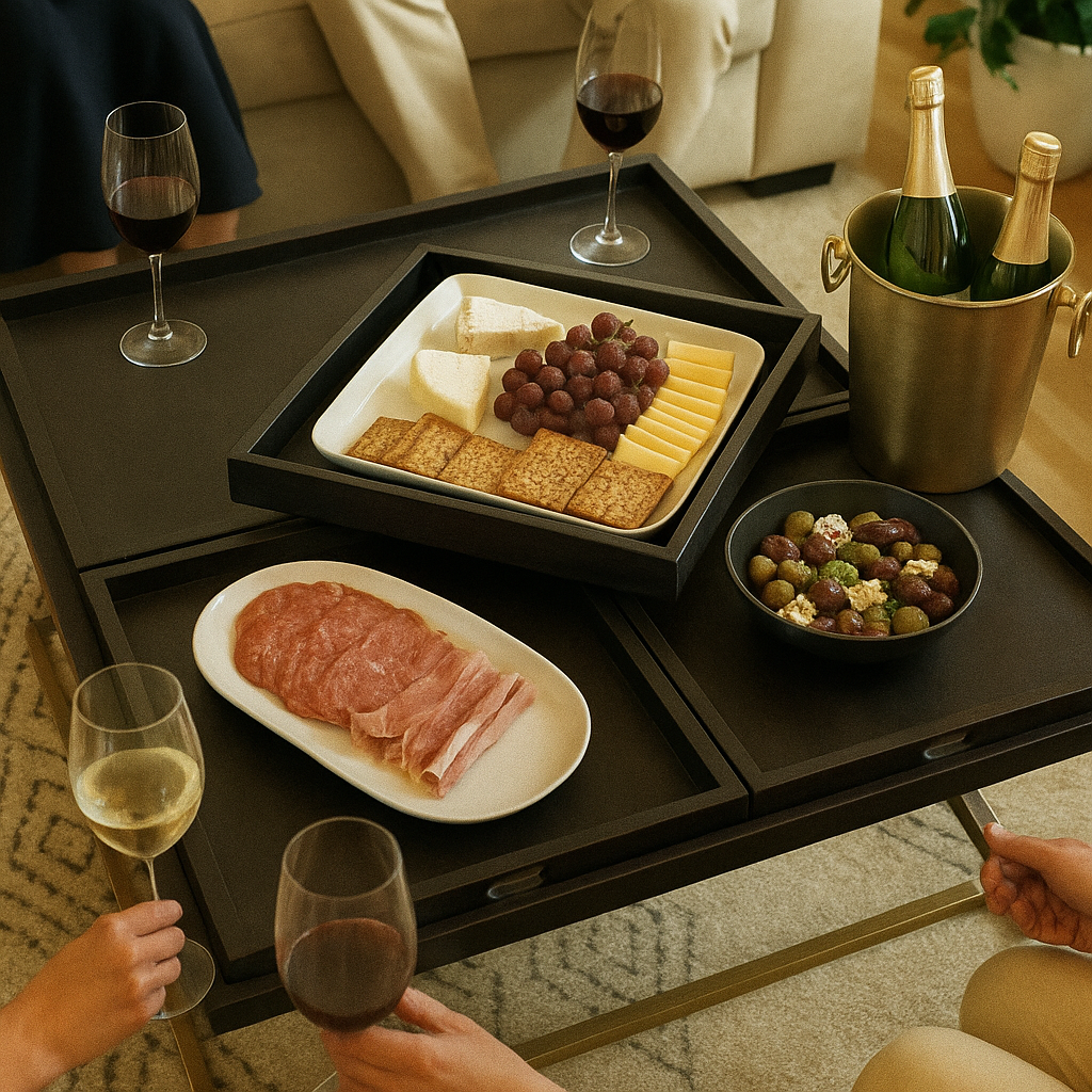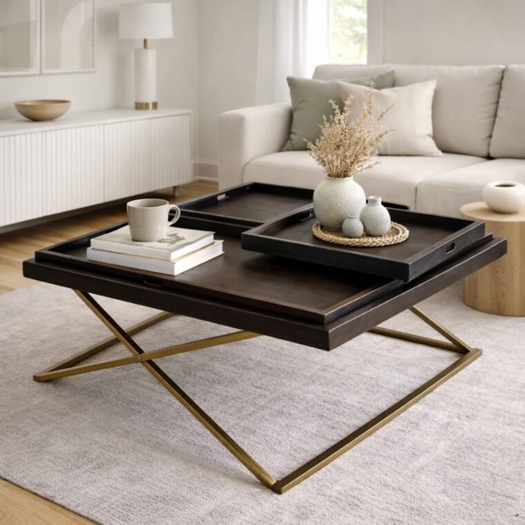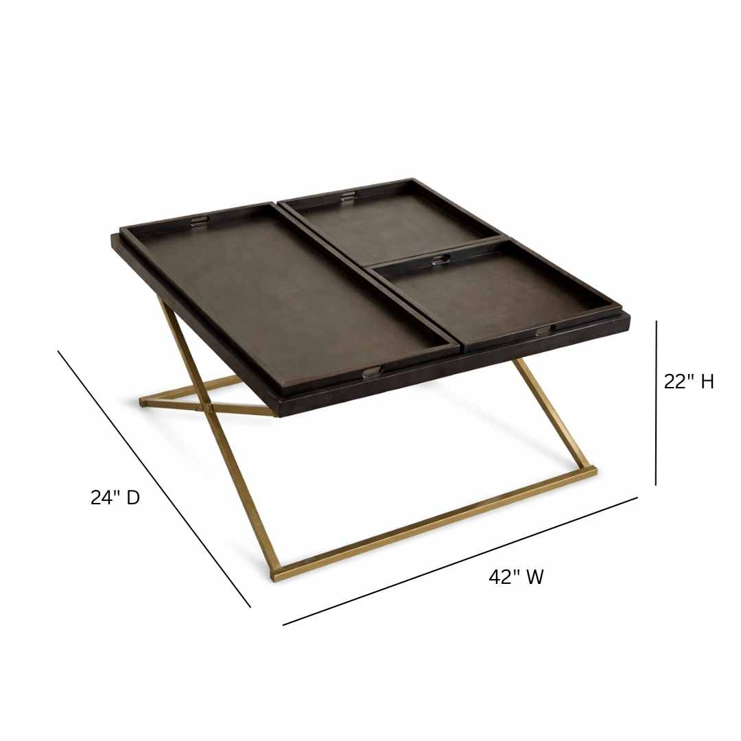 Introducing our sleek and stylish 42″ Square Coffee Table. With its premium wood table top finished in dark coffee, this table exudes elegance. The gold knock-down metal frame adds a touch of sophistication. It features 3 functional divider trays that can be easily removed, offering versatility and convenience. Elevate your living space with this stunning coffee table.