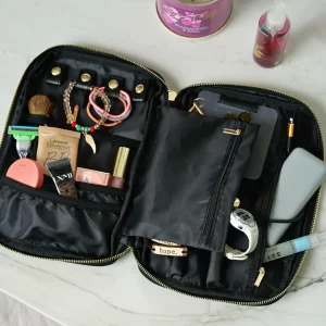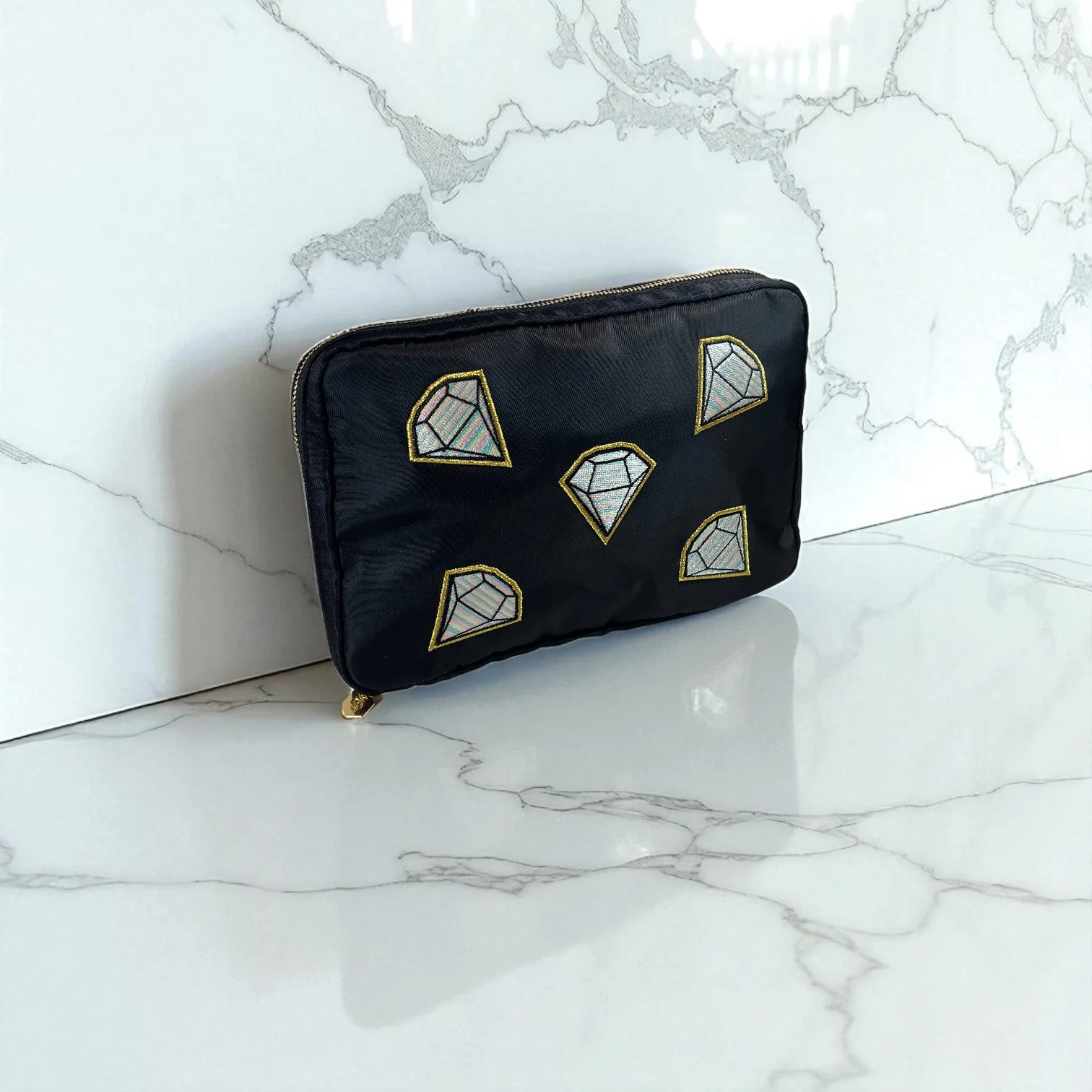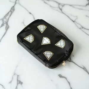 Introducing the Bryn Jewelry Travel Pouch – the ultimate travel companion for your precious accessories. Made from durable nylon, this pouch features embroidered diamonds and plenty of storage options including earring holes, necklace hooks, and divided compartments. The gold hardware and zip closure add a touch of elegance. Whether you’re at home or on the go, this pouch is perfect for keeping your jewelry organized and secure.