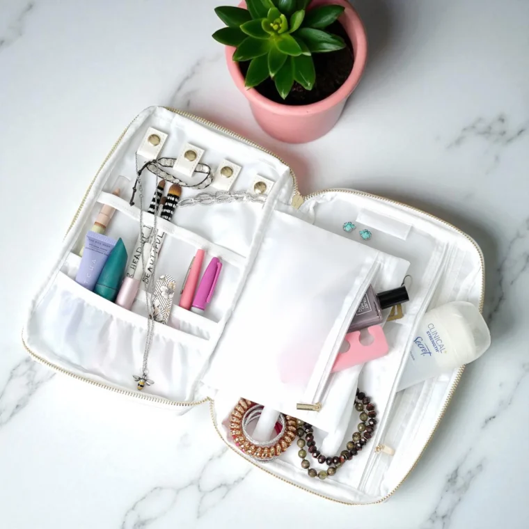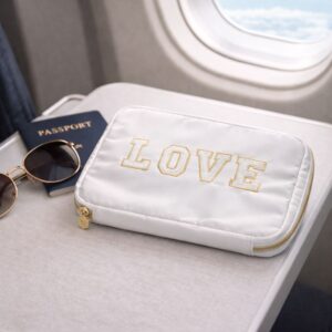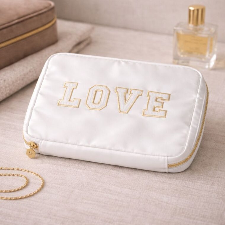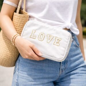 Introducing the Bryn Jewelry Travel Pouch – the ultimate travel companion for your precious accessories. Made from durable nylon, this pouch features an embroidered trendy phrase and plenty of storage options including earring holes, necklace hooks, and divided compartments. The gold hardware and zip closure add a touch of elegance. Whether you’re at home or on the go, this pouch is perfect for keeping your jewelry organized and secure.