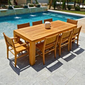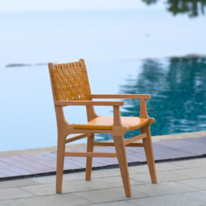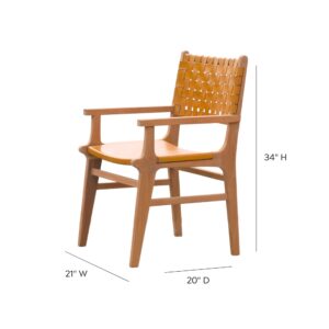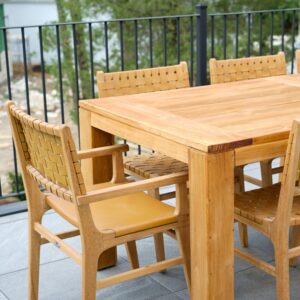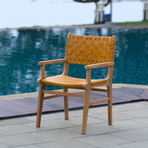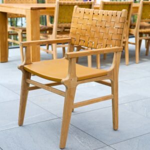 Add natural elegance and artisan detail to your dining space with the Calabasas Woven Leather Dining Chair with Arms. Handcrafted with precision, this luxurious chair features a solid grade-A teak wood frame and woven 1.5″ full-grain leather straps that create a rich texture and timeless look. The addition of sculpted armrests enhances both comfort and presence, making it perfect for the head of the table or as a statement seat. With decorative metal rivets and hand-finished wood, every chair is one of a kind—designed to bring warmth, character, and lasting quality to your space.