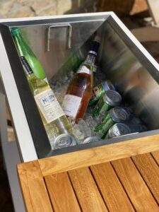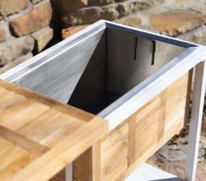 Introducing the Catalina Outdoor Patio Buffet Console, a stylish and functional piece from the Catalina Collection. Expertly crafted with a combination of harvested kiln-dried teak and a sturdy iron base, this console adds both elegance and durability to your outdoor entertaining space. Designed for versatility, it features a sliding teak top, perfect for serving cocktails, appetizers, or storing cold beverages in the included stainless steel beverage tub. Whether you’re hosting a garden party or a casual outdoor gathering, this buffet console will elevate your outdoor dining experience.