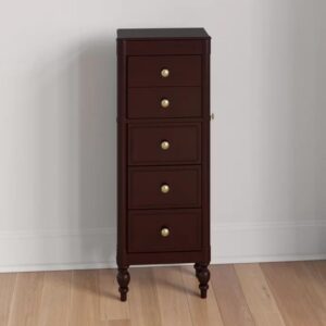 Love this armoire! Purchased for my teen daughter and she is in love with it too. The customer service is fantastic. Very strong and wonderful quality. The color is a very dark brown and is gorgeous. Very quick to put together, just attach the 4 legs and the top….maybe 5 minutes.