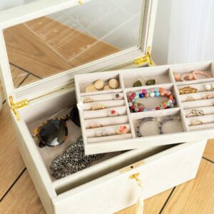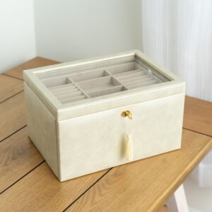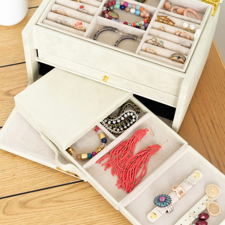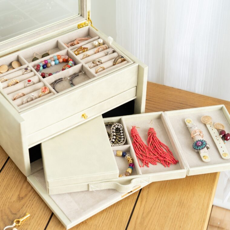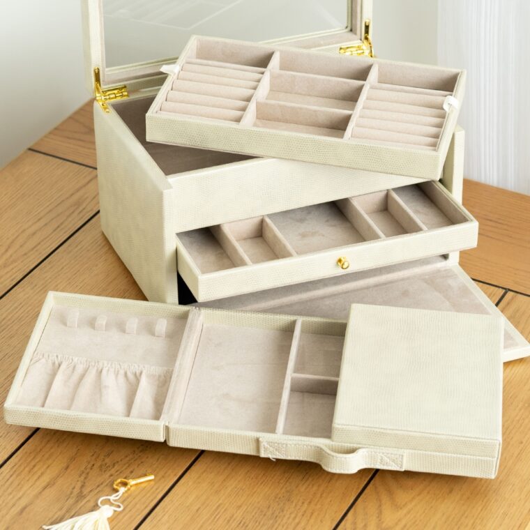 - Removable tray under the top lid with ring rolls and storage compartments, hiding a large open storage space