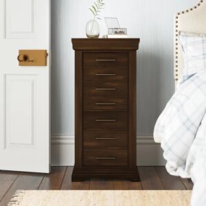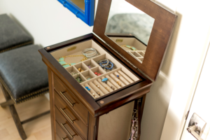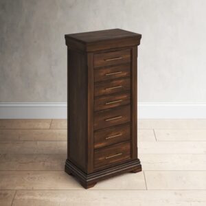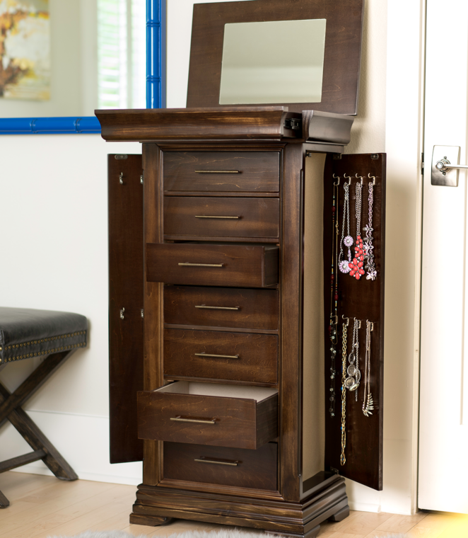Love, love, love. This armoire is perfect! It almost matches the furniture I have in my bedroom, it actually compliments it. There is plenty of room in the chest. It’s very well made quality product. Sturdy. A lot of little dividers for different pieces of jewelry. The last four drawers are “open” where you can store wallets, small purses or watch cases, etc. All the drawers are lined. The top drawer pulls out so I don’t have to open the top to get to the jewelry I wear on a daily basis. It was packaged very well, so there was no defects when I opened the box. The only thing I wish it had was a lock, but in the end that’s no big deal. I highly recommend product.