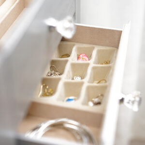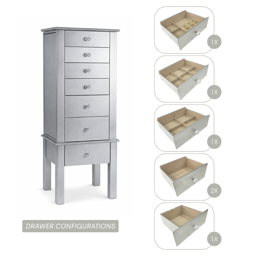 Are you looking for a stylish and functional way to store and organize your jewelry? Look no further than the Hannah Jewelry Armoire! This elegant French-inspired design features beautiful beaded trim and six spacious drawers for all your precious pieces. The two side panel doors even have necklace hooks for added convenience. And with a top lid that opens to reveal a mirror, ring rolls, divided compartments, and even an opening for cord organization, this armoire truly has it all. Plus, the lined compartments ensure that your jewelry stays protected from scratches, while the crystal drawer pulls add an extra touch of class. Experience the ultimate in jewelry storage with the Hannah Jewelry Armoire!