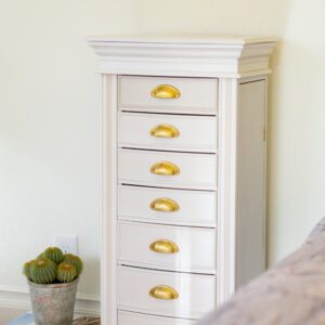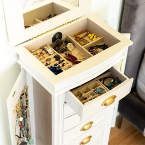I have looked for a long time for a jewelry armoire to accommodate all my jewelry. This piece is not only great looking, but very well made. Tons of room to hang necklaces in each side compartment, with plenty of space in the drawers for rings, earrings bracelets and shorter necklaces. I ordered extra earring compartments, which will keep earrings even more organized. I LOVE this jewelry furniture!!!