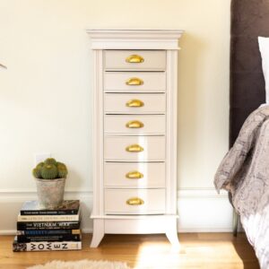 This is the 1st Jewelry box I have owned and I am in love. It’s a cream color and the individual drawers open with slots for my rings earrings and watches. I fell in love with the Hillary armoire immediately! If your having doubts just take the plunge and buy it you won’t regret it.