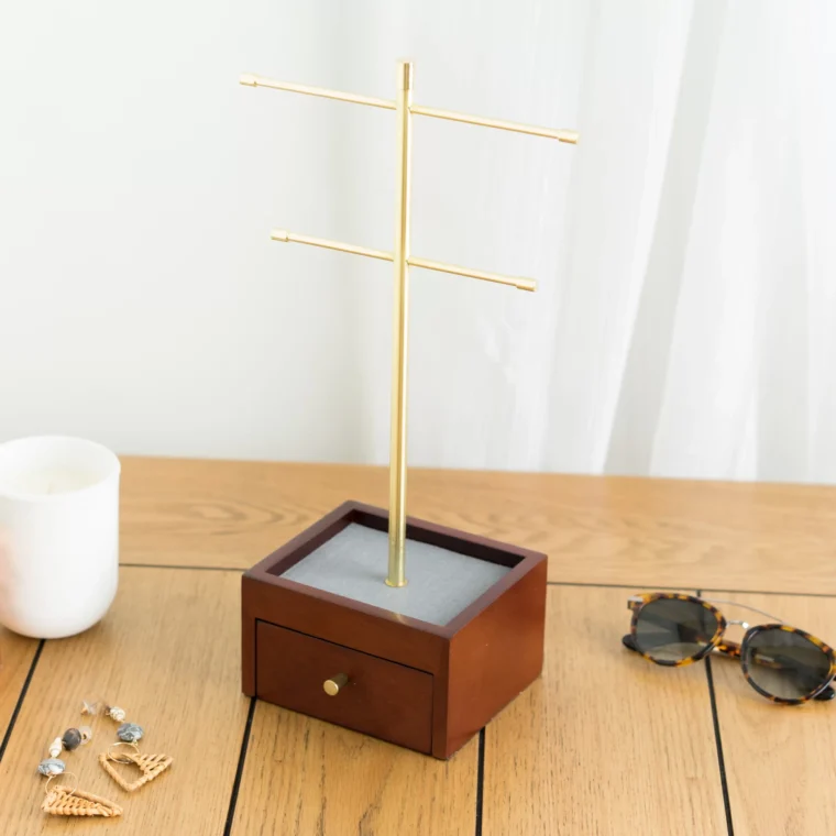 The Katie Jewelry Stand is a chic and functional organizer for your jewelry collection. It features a two-tiered T-bar in gold for hanging bracelets, earrings, and necklaces. A pull-out drawer with ring rolls and a built-in jewelry dish, both lined in anti-tarnish linen, keep your pieces protected. The stand’s rich walnut base adds elegance, making it a stylish addition to any space.