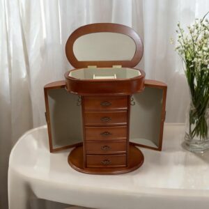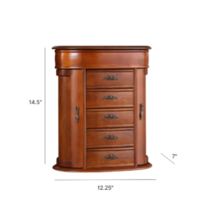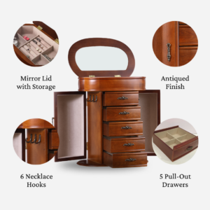 - 5 pull-out drawers and two side doors that open to reveal 3 necklace hooks in each