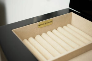 - Hinged mirrored lid opens to reveal compartments, ring rolls, and cord management port.