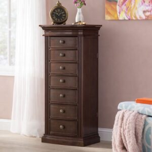 Get ready to showcase your precious jewelry in style with the Landry Jewelry Armoire by Hives Honey! This classic piece boasts a stunning dark walnut finish, inspired by the elegance of English design. With its sturdy and durable construction, this armoire is the perfect addition to any home decor. Featuring 7 pull-out drawers, 4 of which include divided compartments, and 12 necklace hooks on each side door, you’ll have ample space to store all your favorite pieces. Plus, the anti-tarnish felt lining ensures your jewelry stays in pristine condition. We’re excited to help you elevate your jewelry game with the Landry Jewelry Armoire!