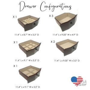 This is absolutely beautiful. Came well packaged. Bottom 5 drawers are not compartmentalized. This is OK for the larger ones, but the other two smaller ones should have been for more organization. Needs more slots for earrings. Love the side doors for necklaces and bracelets. Lots of room. Overall I am very happy with it.