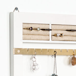 Hang your jewelry collection on the wall to display with the May Jewelry Frame. Featuring ring rolls, necklace and earring hooks, and a bracelet bar, there are plenty of ways to organize your baubles and beads. Contemporary yet understated with a crisp white finish, natural linen and grazed gold hardware you’ll have the perfect backdrop for your accessories.