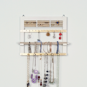 - Features ring rolls, earring slots, necklace hooks, and bracelet bar