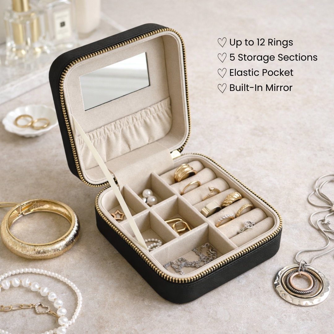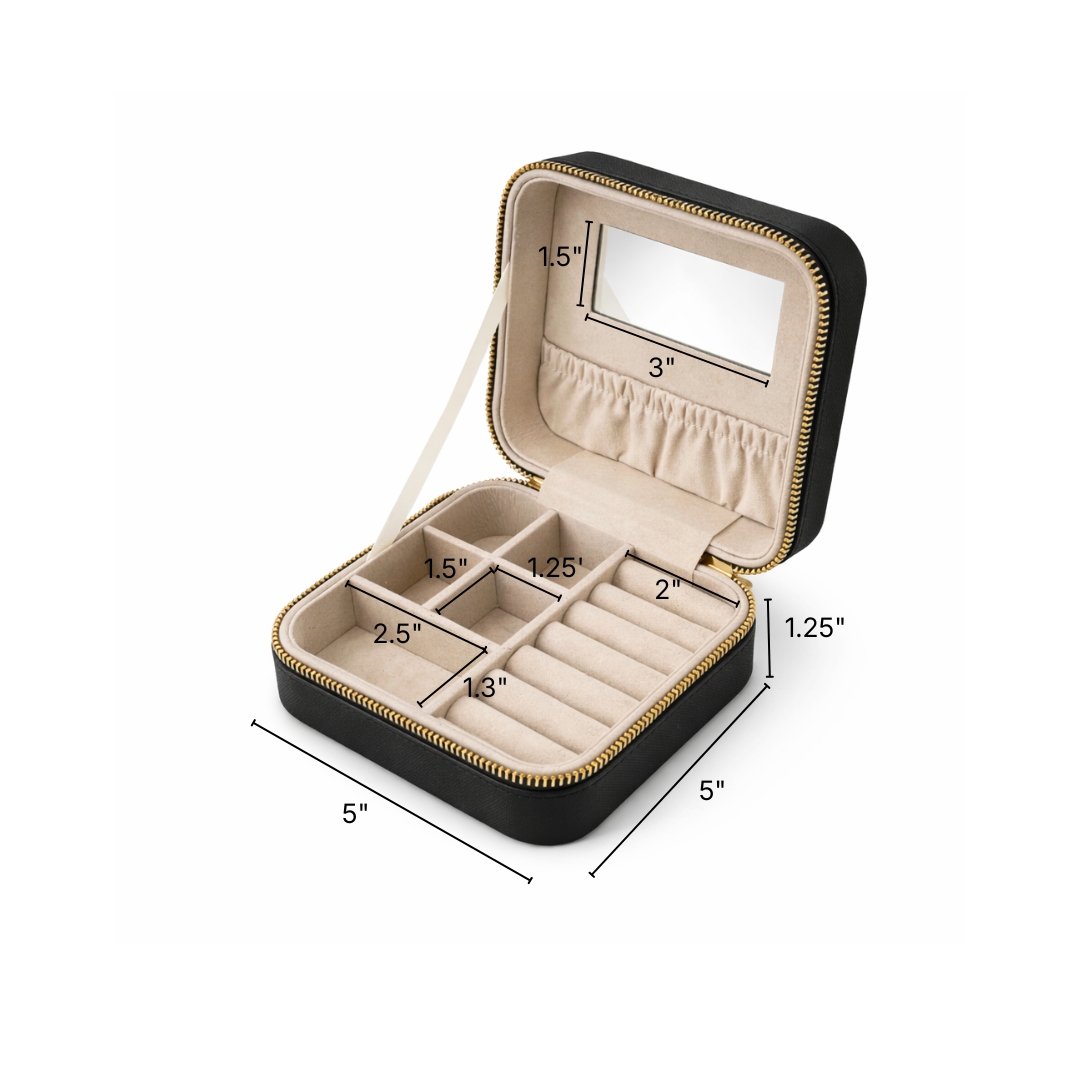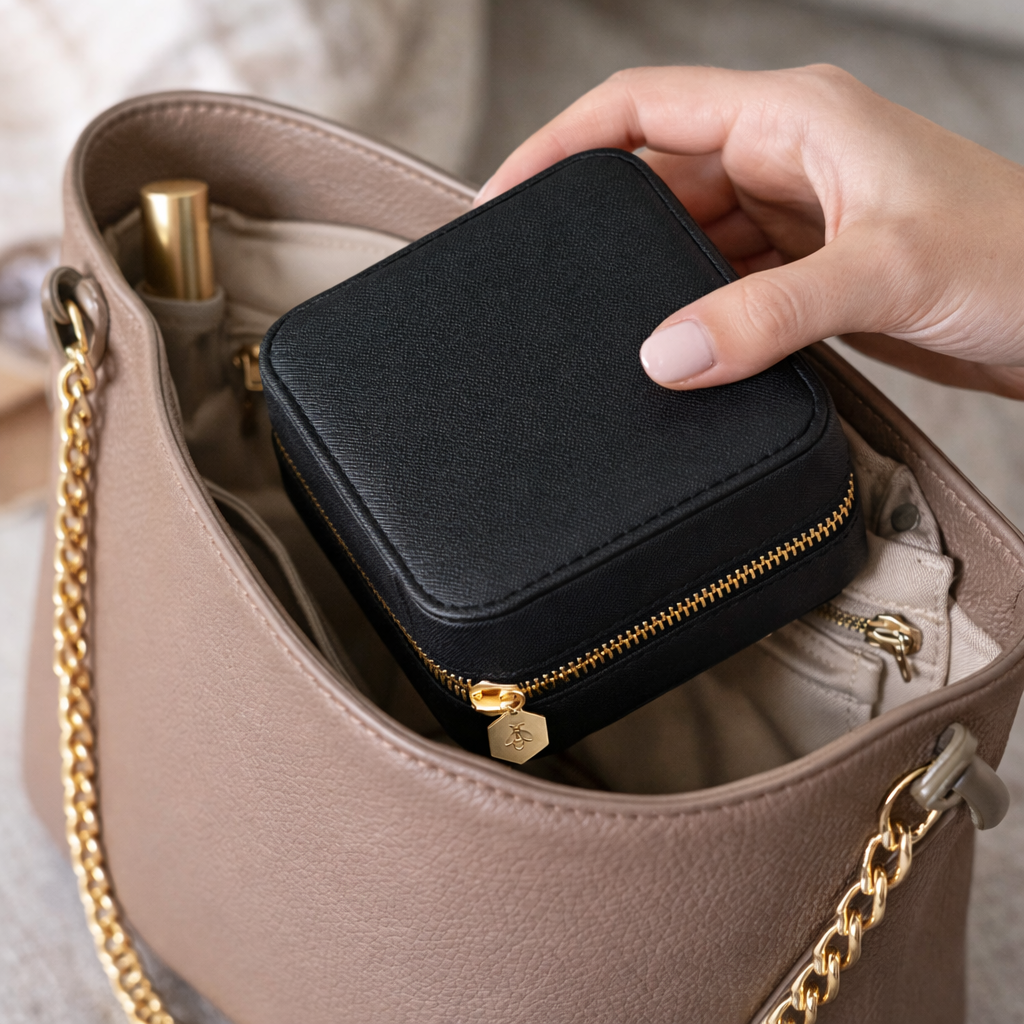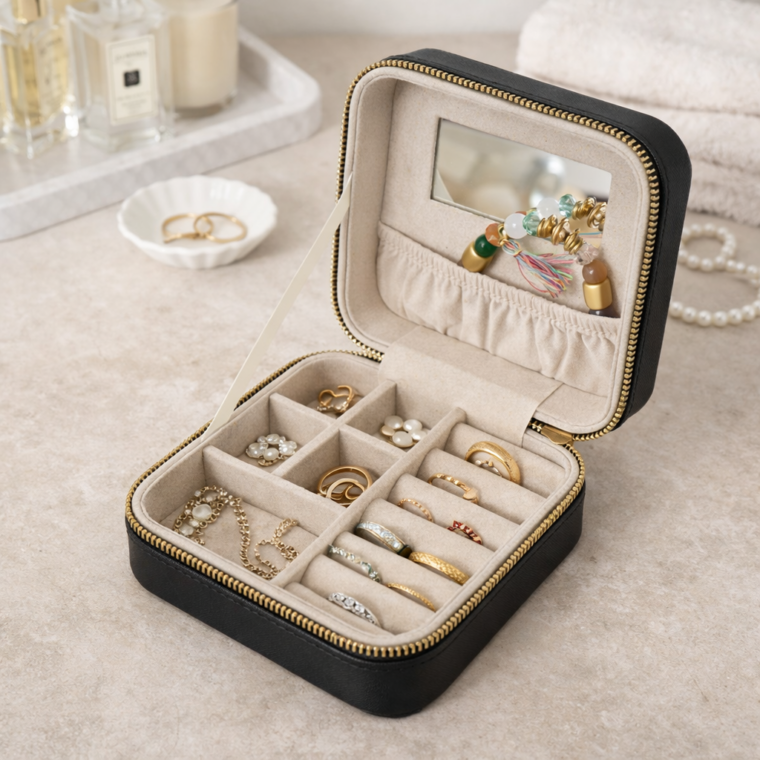 Travel with confidence knowing your jewelry is safe, organized, and tangle-free with the Mya Jewelry Travel Case. Thoughtfully designed for both style and function, this compact case is crafted from durable saffiano vegan leather and lined with soft anti-tarnish felt to protect your most cherished pieces. Inside, you’ll find seven ring rolls, five divided compartments, a convenient storage pouch, and a vanity mirror—everything you need to keep earrings, rings, necklaces, and other small treasures neatly arranged. Lightweight and perfectly sized for purses, totes, or carry-ons, the Mya Travel Case is the elegant solution for jewelry lovers on the go.