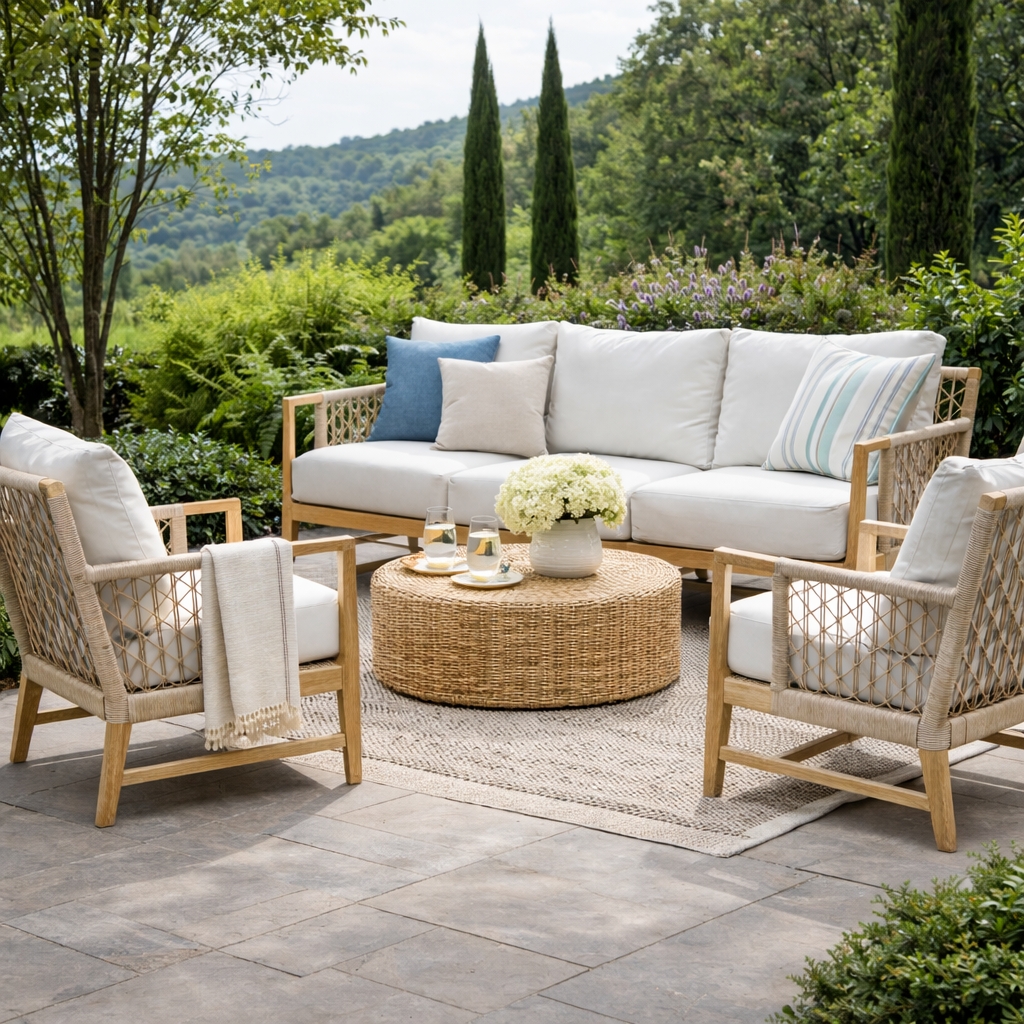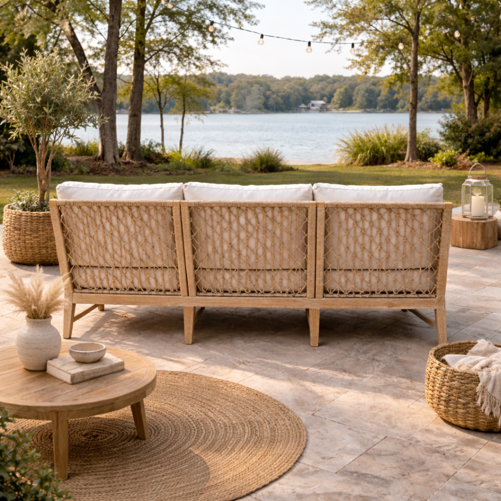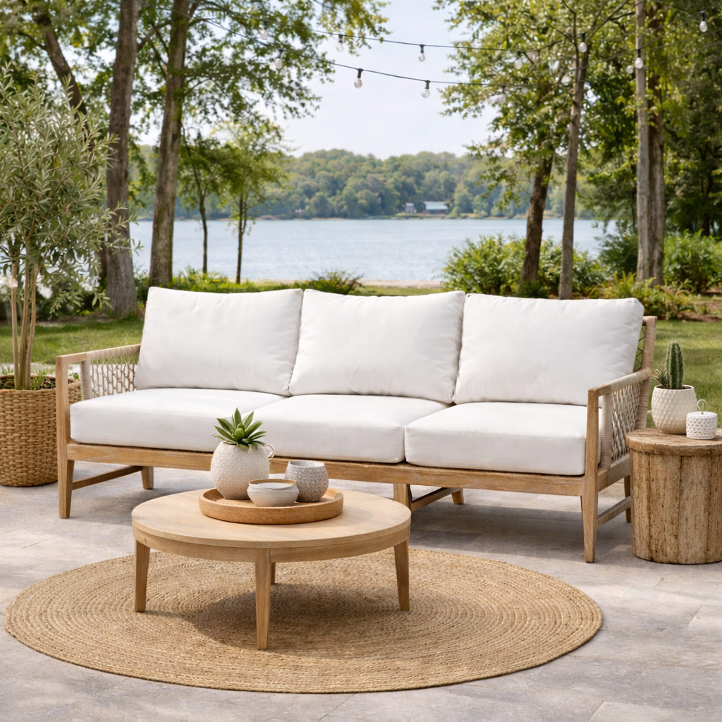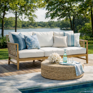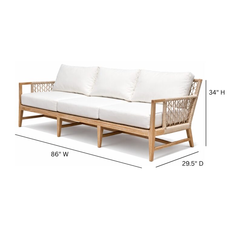 Elevate your outdoor space with the Nizuc 86″ Outdoor Teak Sofa, a luxurious addition that blends bohemian style with modern sophistication. Featuring crisp white cushions, woven rope details, and warm Grade-A teak, this sofa creates an inviting atmosphere that’s both comfortable and visually stunning. With deep seating and a solid construction, this piece ensures durability and comfort. The 86″ size offers ample seating, making it perfect for larger patios or gatherings. Pair it with other pieces from the Nizuc Collection to complete your dream outdoor space.