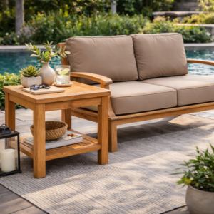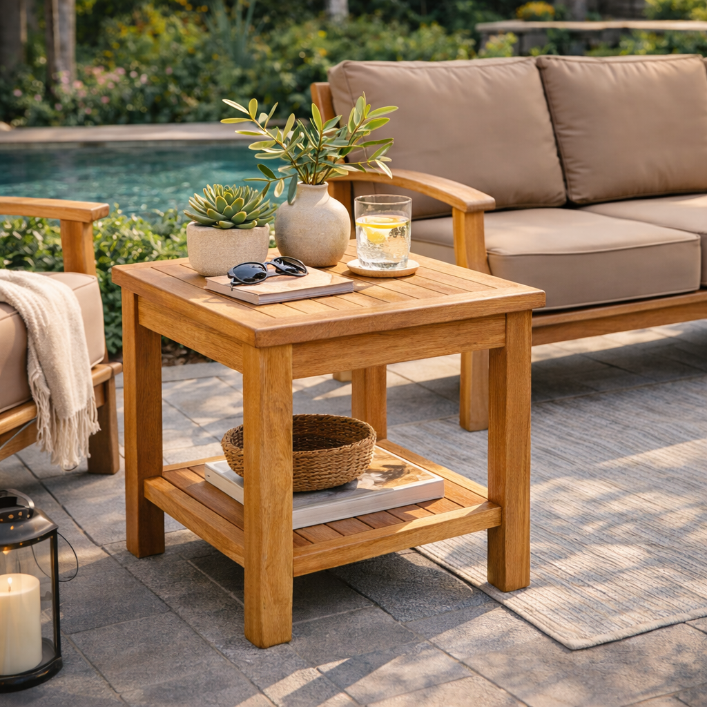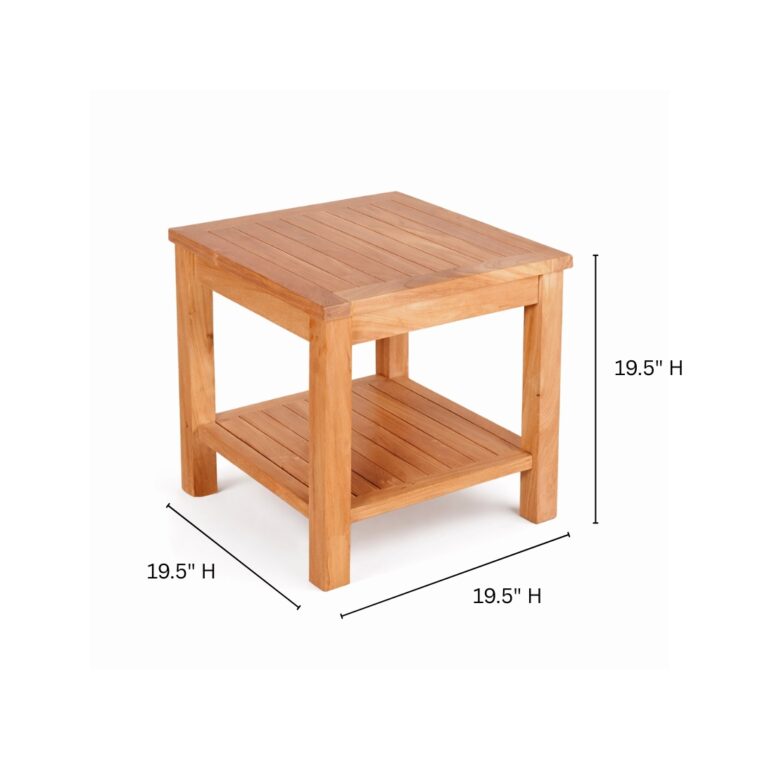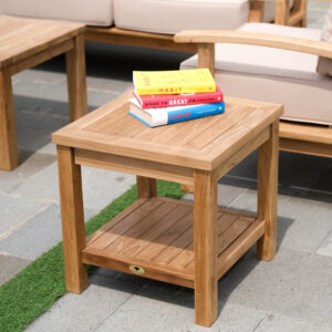 Enhance your outdoor space with the Pavilion Teak Square Side Table, a beautifully crafted two-tier teak table designed for both style and functionality. Made from premium Grade-A teak, sustainably sourced from government-controlled forestry in Indonesia, this table offers exceptional durability and weather resistance. Its sleek, square design seamlessly complements the Pavilion Collection or any outdoor furniture setup, providing ample space for storage, décor, or everyday essentials.