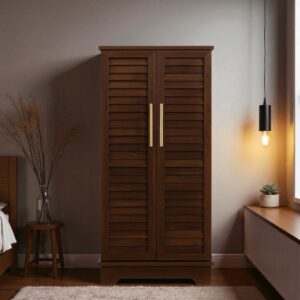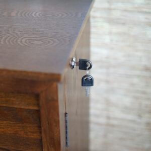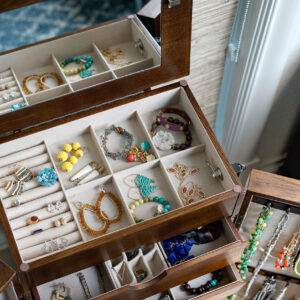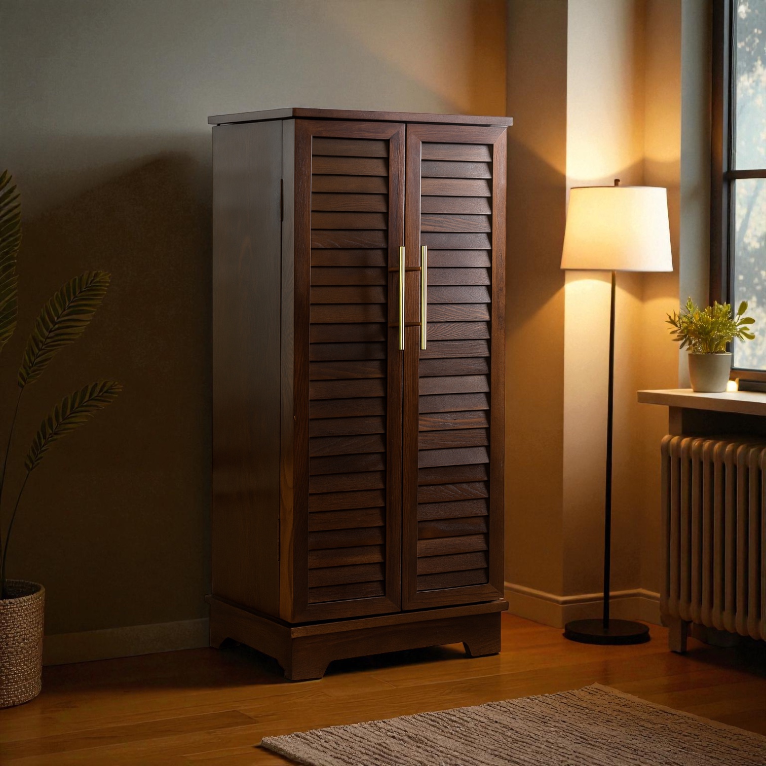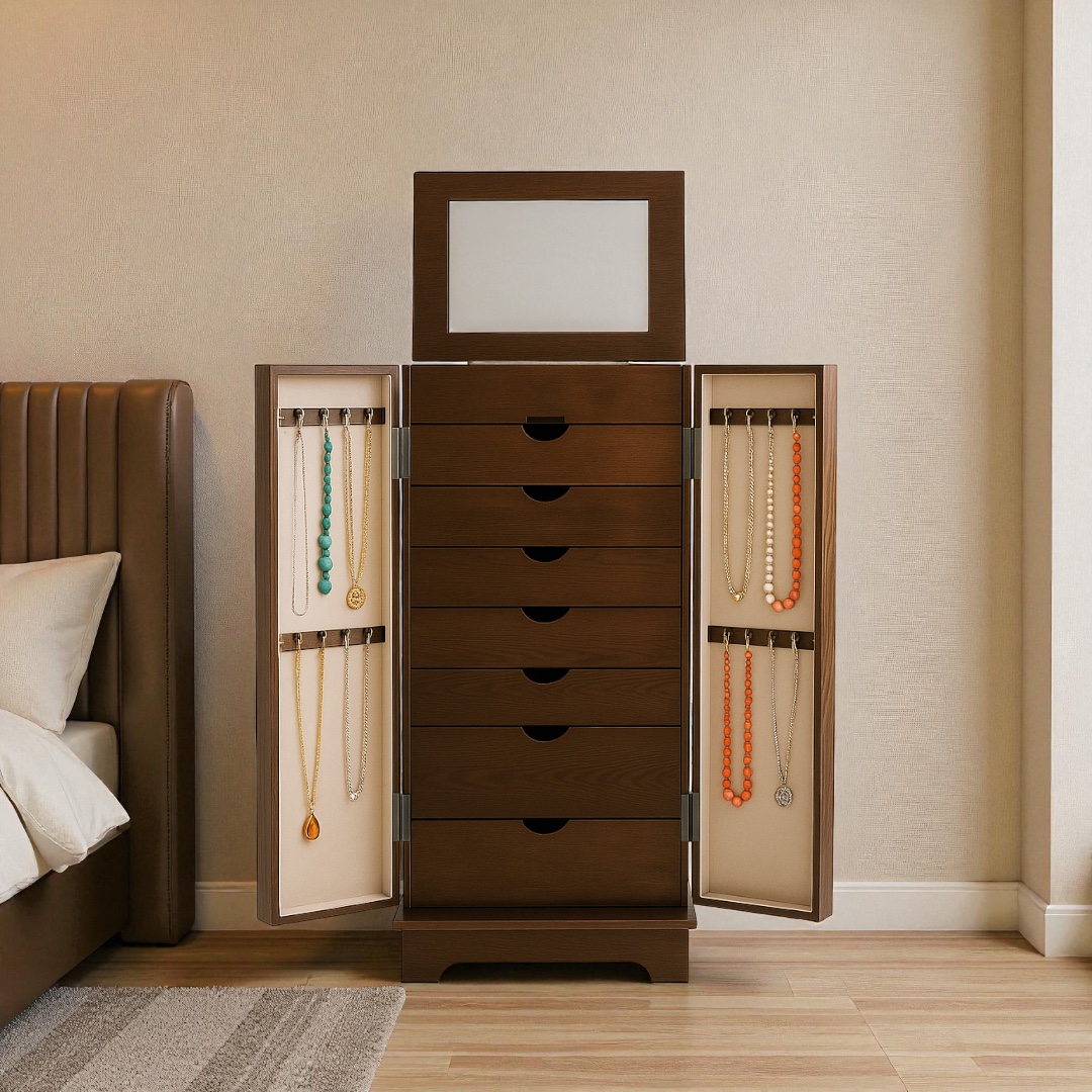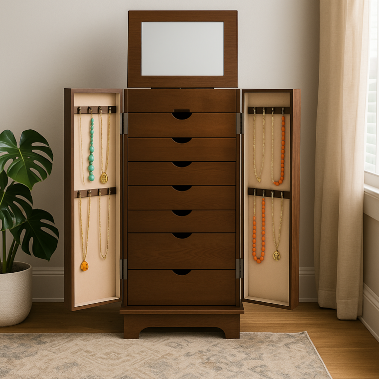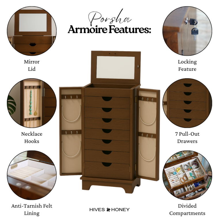 Elevate your jewelry storage with the timeless elegance and security of the Hives and Honey Port Jewelry Armoire. Expertly crafted from high-quality solid wood veneers, this fully locking armoire offers the perfect blend of style and function. Its chic shutter-style doors with gold hardware open to reveal seven spacious drawers, thoughtfully designed with a mix of divided compartments and open storage. Inside, you’ll find necklace hooks, ring rolls, an earring tray, and a built-in vanity mirror under the lid—all lined with anti-tarnish felt to keep your jewelry protected and pristine. Whether you’re storing everyday pieces or family heirlooms, the Port Armoire keeps everything organized, accessible, and beautifully displayed.