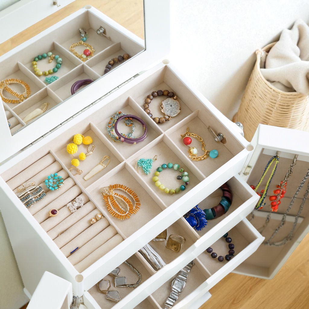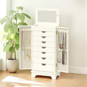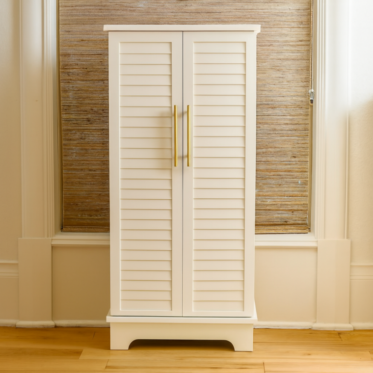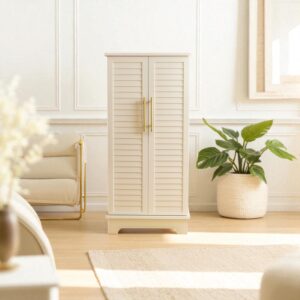 Elevate your jewelry storage with the timeless elegance and security of the Hives and Honey Port Jewelry Armoire. Expertly crafted from high-quality solid wood veneers, this fully locking armoire offers the perfect blend of style and function. Its chic shutter-style doors with gold hardware open to reveal seven spacious drawers, thoughtfully designed with a mix of divided compartments and open storage. Inside, you’ll find necklace hooks, ring rolls, an earring tray, and a built-in vanity mirror under the lid—all lined with anti-tarnish felt to keep your jewelry protected and pristine. Whether you’re storing everyday pieces or family heirlooms, the Port Armoire keeps everything organized, accessible, and beautifully displayed.