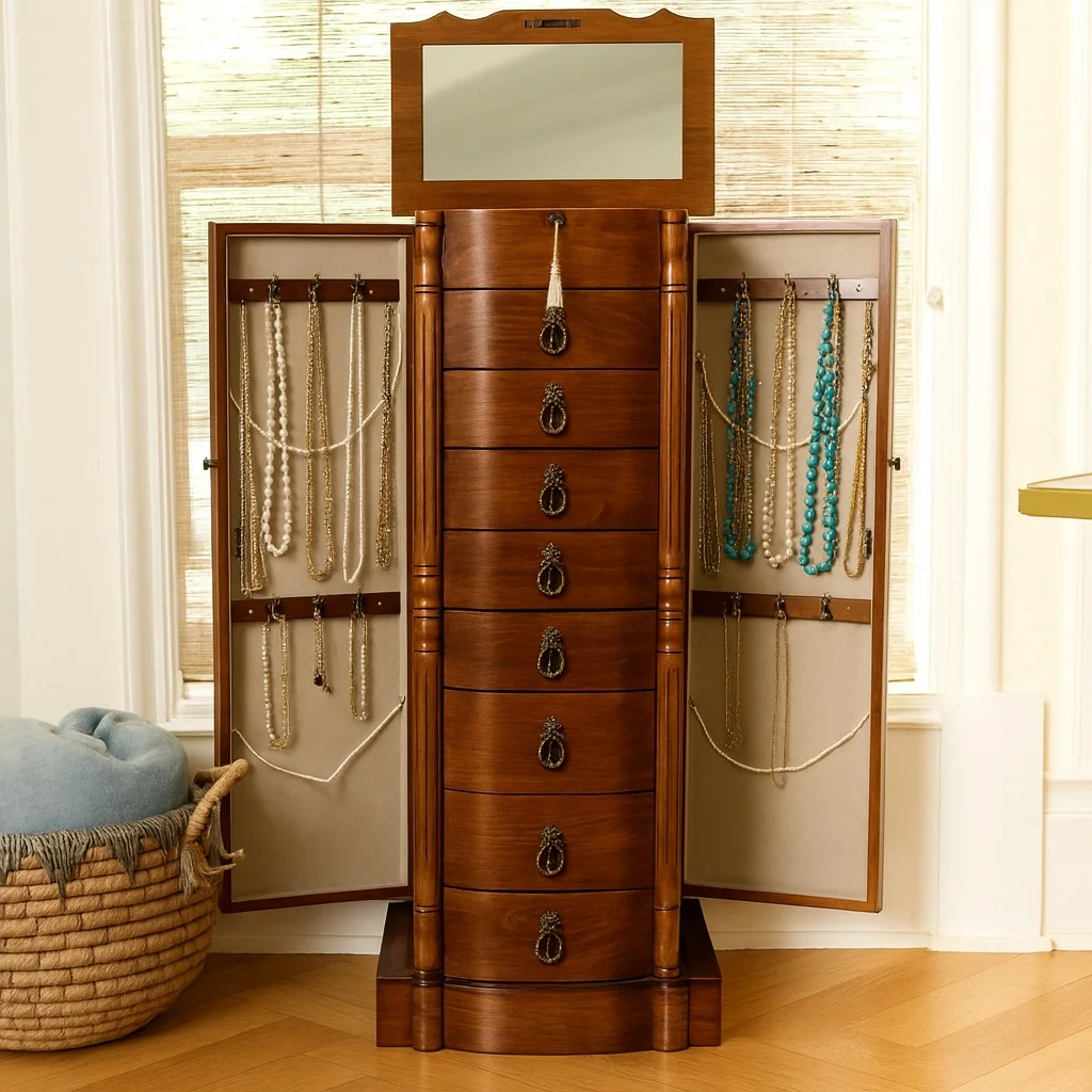 I love my Robyn Jewelry Armoire! It is perfect for my extensive jewelry collection. My husband bought it for me for Christmas, and I cannot live without it! I love all the compartments and drawers. I also love that it locks! The craftsmanship is wonderful. It also goes perfectly with my antique furniture even though is is brand new. I would definitely recommend this to a friend!