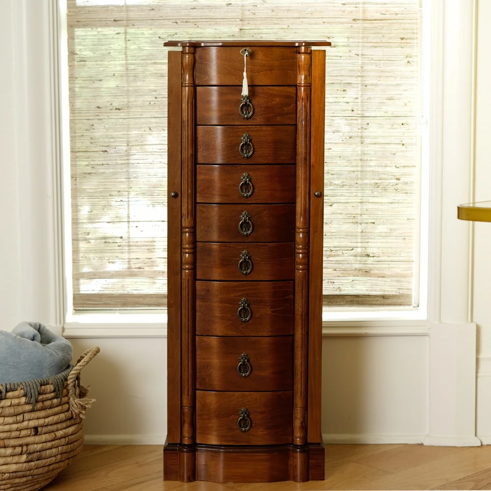 Elevate your jewelry collection with the timeless beauty of the Robyn Jewelry Armoire. Boasting a classic design, this armoire features 8 drawers that offer generous space for your necklaces, bracelets, earrings, and more. The top compartment opens to reveal a vanity mirror, ring rolls, and divided compartments for easy access to your everyday essentials. Crafted with attention to detail, the stunning bronze hardware adds a touch of sophistication to its streamlined silhouette. Inspired by Dutch design, the curved front exudes elegance and grace. Plus, the lockable feature ensures that your precious pieces are kept safe and secure. Experience the perfect harmony of style and functionality with the Robyn Jewelry Armoire.