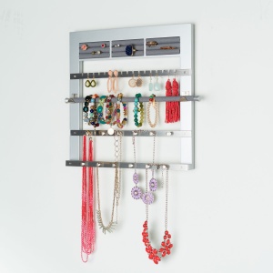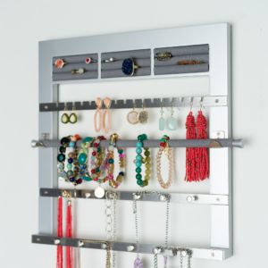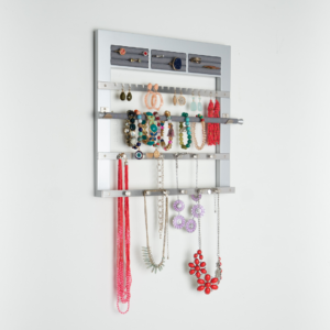 Are you tired of seeing your jewelry spread out over your bathroom counter top or dresser? Worry no more, the Tori Wall Hanging Jewelry Rack will get your organized! Display all of your jewelry in one place. Available in three colors.